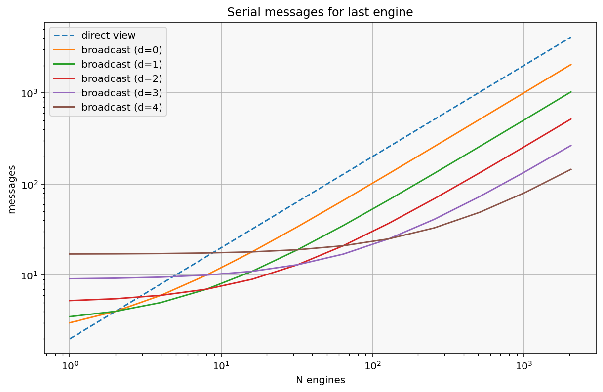Since we are talking about delivering messages to all engines, the metric of interest for a ‘cold start’ is how many messages must the last engine wait for before its message is delivered, because until that point, at least some of the cluster is idle, waiting for a task. This is where the parallelism comes into play.
