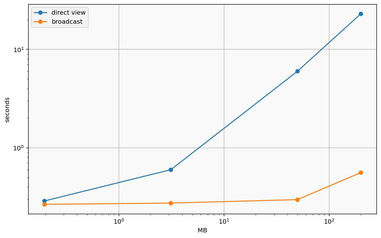 df = pd.DataFrame({"n": n_list, "direct view": dview_times, "broadcast": bcast_times})