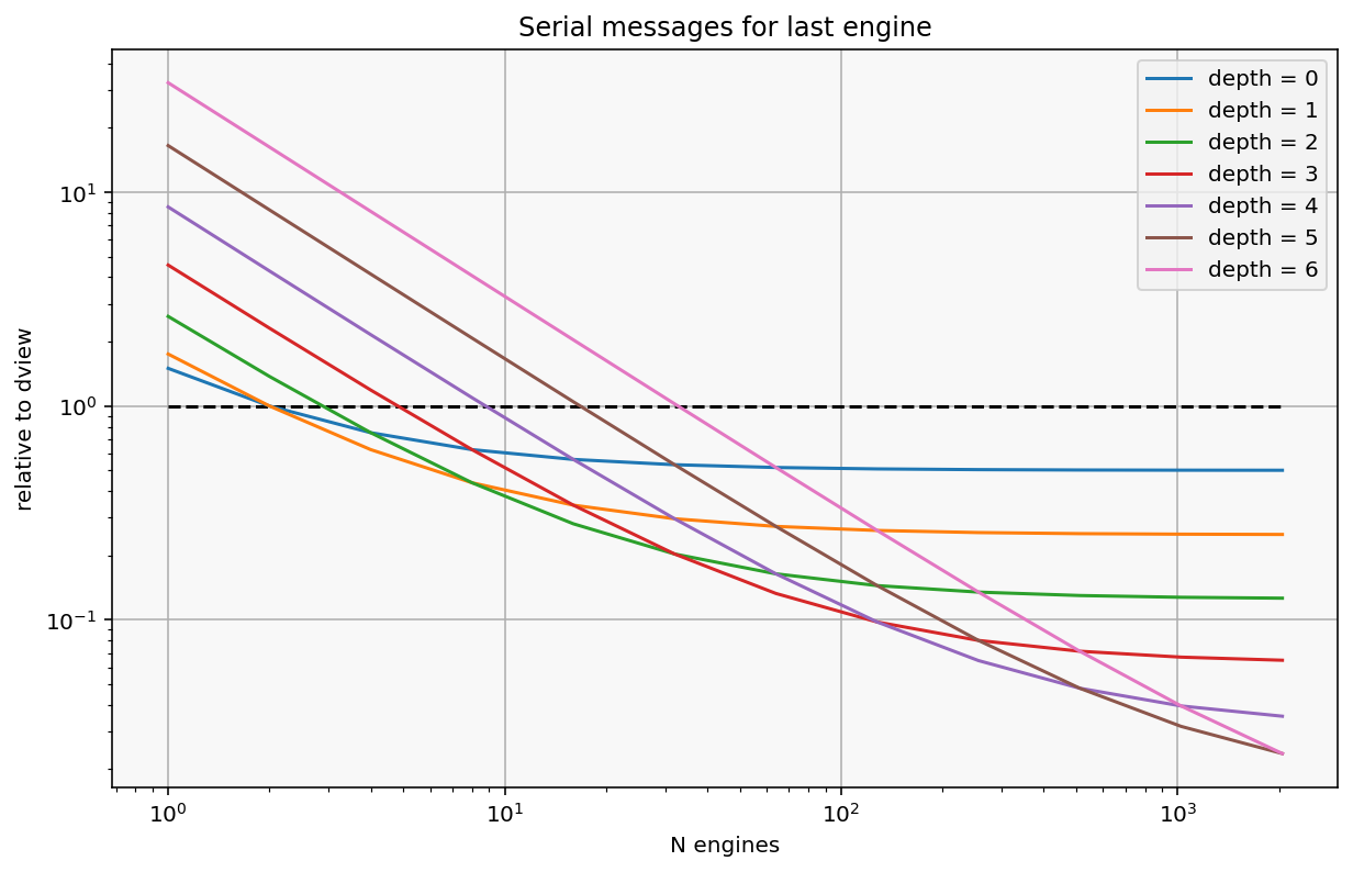 sends to get the first message to the last engine (and therefore all engines). This is a good approximation of how deep your scheduler should be based on the number of engines. It is an approximation because it doesn’t take into account the difference in cost between a local zmq send call vs a send actually traversing the network and being received.